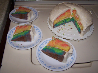 So there you have it! I'm going to consider this cake a success. By the way, wurwolf and I were talking about whether my Dad would appreciate all the extra effort that went into the colors and stuff. I can tell you that, as expected, Dad's reaction to this cake was the same as Dad's reaction to every other cake I've made him, whether it was good or disasterous: